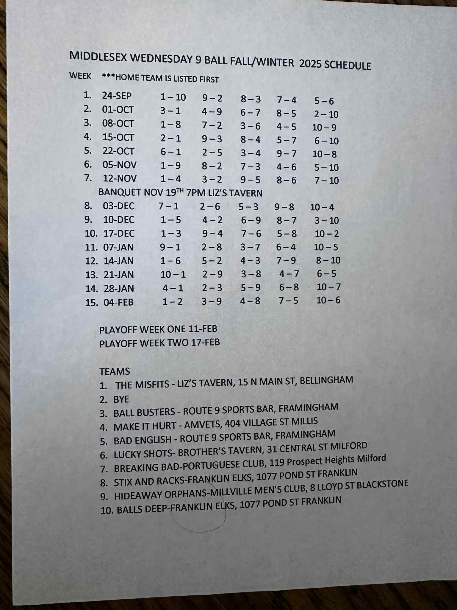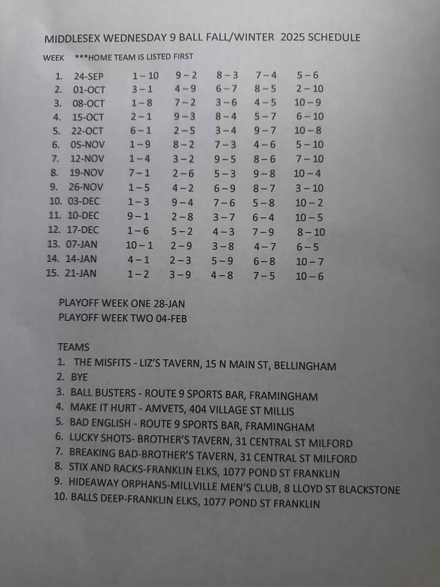 Schedules for Middlesex County Tap See the current schedules by clicking on the expandable boxes below. Middlesex TAP MONDAY 8 BALL SCHEDULE MIDDLESEX FALL/WINTER 2025 MONDAY 8 BALL SCHEDULE Middlesex TAP WEDNESDAY 9 BALL SCHEDULE MIDDLESEX TAP FALL WINTER 2025 WEDNESDAY 9 BALL SCHEDULE Click here to view Schedules Traveling Team Tournament Info Schedules for Middlesex County Tap TAP Player Statistics Follow Us Facebook